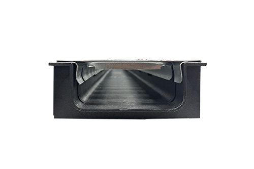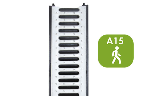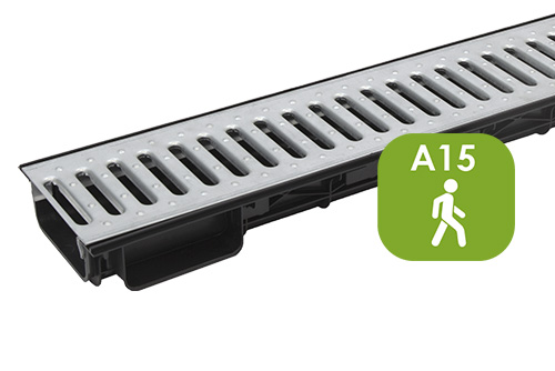 Канал пластиковый системы Lite из вторичного ПЭ-ПП. Сформированное отверстие для подключения труб Ø 110 для выпуска через дно лотка. Специальный паз для подключения других лотков под углом 90º и специальным пазом для распила лотка. Оцинкованная решётка без болтового крепления. Класс нагрузки А 15.
