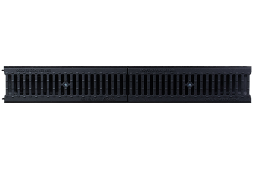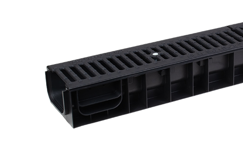 Канал пластиковый системы STANDART из вторичного ПЭ-ПП. Сформированное отверстие для подключения труб Ø 50 мм., Ø 110 для выпуска через дно лотка. Специальный паз для подключения других лотков под углом 90º и специальным пазом для распила лотка. Чугунная решетка с продольными щелями. Крепление: крепеж-валик элемент безболтового соединения решетки с лотком (класс нагрузки С250).